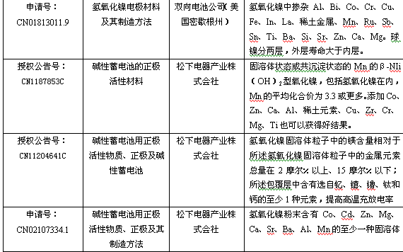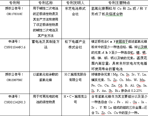 將(jiang)上(shang)述(shu)元(yuan)素(su)在(zai)正(zheng)極(ji)材(cai)料(liao)球(qiu)形(xing)氫(qing)氧(yang)化(hua)鎳(nie)生(sheng)產(chan)過(guo)程(cheng),采(cai)用(yong)摻(chan)雜(za)到(dao)層(ceng)狀(zhuang)結(jie)構(gou)氫(qing)氧(yang)化(hua)化(hua)鎳(nie)中(zhong),取(qu)代(dai)部(bu)分(fen)鎳(nie)離(li)子(zi),形(xing)成(cheng)固(gu)溶(rong)體(ti),使(shi)元(yuan)素(su)之(zhi)間(jian)均(jun)勻(yun)性(xing)更(geng)好(hao);在球形氫氧化鎳外麵包覆一層鈷的氫氧化物等,對於提高電池整體性能,均有改善功能。具有代表性的專利見下表: