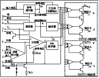 SG3525是美國通用公司的產品,如圖2所示,內部電路主要由基準電源、振蕩器、誤差放大器、PWM比較器與鎖存器、分相器、欠電壓鎖定、輸出級、軟ruan啟qi動dong以yi及ji關guan斷duan電dian路lu等deng組zu成cheng。基ji準zhun電dian源yuan是shi一yi個ge典dian型xing的de三san端duan穩wen壓ya器qi,精jing度du可ke達da,采cai用yong了le溫wen度du補bu償chang。作zuo為wei內nei部bu電dian路lu的de供gong電dian電dian源yuan,並bing可ke向xiang外wai輸shu出chu40mA電流。振蕩器由一個雙門限比較器,一個恒流源及電容充放電電路組成,在芯片外部由5腳對地接一電容器,6腳對地接一電阻,5腳和7腳之間外接電阻即可構成該振蕩器。