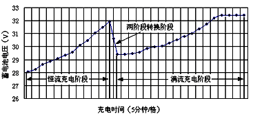 使用該蓄電池充電器對某型號航空蓄電池進行了充電試驗,最大充電電流限製為30A,溫度限製值定為350C。蓄電池的初始電壓為20V,充電開始時,充電器以20A的電流對蓄電池持續充電約58分鍾,然後以較小的電流3A對蓄電池進行涓流充電,直至蓄電池電壓上升到32.45V時,蓄電池兩端的電壓不再發生明顯的上升現象,此時充電器停止充電,曆時150分鍾,充電過程曲線示意圖如圖6所示。