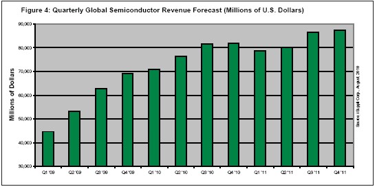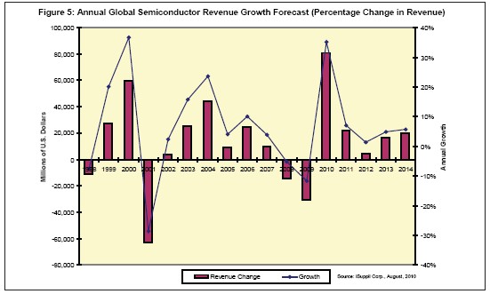 iSuppli公司預測,半導體產業將連續增長七個季度,然後在2011年第一季度出現季節性下降。 這將是該產業在1991至1995年期間連續增長19個季度之後,連續增長時間最長的一次。