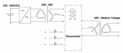 這(zhe)些(xie)問(wen)題(ti)都(dou)可(ke)以(yi)通(tong)過(guo)無(wu)變(bian)壓(ya)器(qi)逆(ni)變(bian)器(qi)技(ji)術(shu)來(lai)避(bi)免(mian)。無(wu)變(bian)壓(ya)器(qi)逆(ni)變(bian)器(qi)可(ke)以(yi)被(bei)並(bing)聯(lian)到(dao)一(yi)個(ge)中(zhong)壓(ya)變(bian)壓(ya)器(qi)的(de)單(dan)獨(du)繞(rao)組(zu)上(shang)。每(mei)組(zu)逆(ni)變(bian)器(qi)僅(jin)需(xu)要(yao)一(yi)個(ge)獨(du)立(li)、標準的1000、1500、2000或2500kVARguigedezhongyabianyaqi。zhejiuweizhandianpeizhitigonglezhongduokenengxing。youyuqidianliudiyuchuantongnibianqidedianliu,yincianzhinibianqihebianyaqidefangshihaiyougengduolinghuoxuanze。[page]