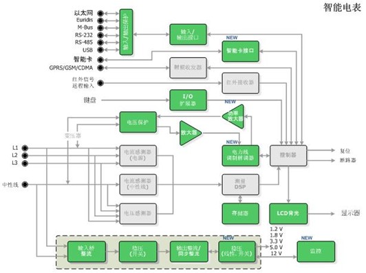 安森美半導體應用於智能電表的完整解決方案安森美半導體應用於智能電表的方案包含一係列標準產品、專用標準產品(ASSP)及專用集成電路(ASIC),可以提供智能電表的4種基本功能,包括:電源/電源管理、計量、寄存及通信,具體產品包括功率因數控製器、交流-直流(AC-DC)控製器、直流-直流(DC-DC)控製器、穩壓器,MOSFET、整流器、三端雙向可控矽開關元件(TRIAC),PLC調製解調器、線路驅動器及信號放大器,濾波、輸入/輸出(I/O)及數據保護,LCD背光驅動器,EEPROM存儲器,及智能卡接口等。圖2是由安森美半導體的多種器件(圖中綠色部分)構成的智能電表應用。