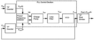 ---其中PLL的部分具有兩個輸入端,分別為參考頻率(Fref)與反饋頻率(Fvco),與一個輸出端(Fout)。三者之間關係可以公式表示如下。