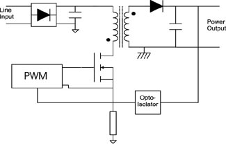 開關電源電路有許多種,但最常見的是反激式轉換器,其原理如圖1所示,電源輸入首先經過整流,然後濾波,接下來經過變壓器和初級開關,以及初級控製器;這個控製器根據反饋信號來改變開關的占空比,反饋信號是由次級反饋而來。