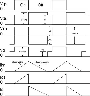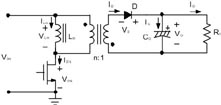盡jin管guan可ke采cai用yong電dian感gan器qi,但dan所suo示shi設she計ji采cai用yong的de是shi未wei隔ge離li的de變bian壓ya器qi。隔ge離li設she計ji在zai離li線xian設she備bei中zhong更geng為wei常chang見jian,在zai離li線xian設she備bei中zhong,變bian壓ya器qi具ju有you隔ge離li作zuo用yong,可ke方fang便bian地di實shi現xian占zhan空kong比bi調tiao整zheng。反fan激ji式shi開kai關guan電dian源yuan可ke在zai非fei連lian續xu導dao通tong和he連lian續xu導dao通tong兩liang種zhong模mo式shi下xia工gong作zuo,不bu連lian續xu導dao通tong模mo式shi如ru圖tu2所示。Ilm和Vlm是變壓器磁化電感通過的電流和施加的電壓。