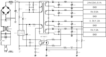 有四個次級線圈提供四路電壓輸出,通過一個光耦,由431型電壓參考器提供反饋信號。