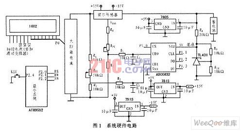 係統硬件電路如圖1所示,主要由太陽能電池組、霍爾電流傳感器組成的,I/U轉換電路、液晶1602組成的顯示裝置、AT89S52單片機構成的控製係統,以及鉛酸蓄電池構成的儲能係統5部分組成。其工作過程:太tai陽yang能neng電dian池chi接jie收shou光guang照zhao時shi,產chan生sheng電dian流liu,對dui蓄xu電dian池chi充chong電dian,單dan片pian機ji通tong過guo穩wen壓ya裝zhuang置zhi由you蓄xu電dian池chi提ti供gong驅qu動dong電dian壓ya,對dui太tai陽yang能neng電dian池chi產chan生sheng的de電dian量liang進jin行xing實shi時shi信xin號hao采cai集ji。由you於yu單dan片pian機ji隻zhi能neng接jie收shou電dian壓ya信xin號hao,所suo以yi在zai信xin號hao接jie收shou前qian由youI/U、U/U轉換模塊將信號調至合適的電壓。經內部運算處理,結果送1602液晶顯示裝置顯示電池發電量。