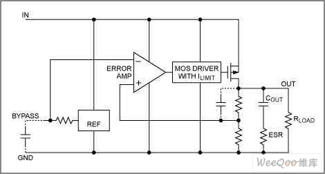 低壓差線性穩壓器(LDO)的結構主要包括啟動電路、恒流源偏置單元、使能電路、調整元件、基準源、誤差放大器、反饋電阻網絡,保護電路等,基本工作原理是這樣的:係xi統tong加jia電dian,如ru果guo使shi能neng腳jiao處chu於yu高gao電dian平ping時shi,電dian路lu開kai始shi啟qi動dong,恒heng流liu源yuan電dian路lu給gei整zheng個ge電dian路lu提ti供gong偏pian置zhi,基ji準zhun源yuan電dian壓ya快kuai速su建jian立li,輸shu出chu隨sui著zhe輸shu入ru不bu斷duan上shang升sheng,當dang輸shu出chu即ji將jiang達da到dao規gui定ding值zhi時shi,由you反fan饋kui網wang絡luo得de到dao的de輸shu出chu反fan饋kui電dian壓ya也ye接jie近jin於yu基ji準zhun電dian壓ya值zhi,此ci時shi誤wu差cha放fang大da器qi將jiang輸shu出chu反fan饋kui電dian壓ya和he基ji準zhun電dian壓ya之zhi間jian的de誤wu差cha小xiao信xin號hao進jin行xing放fang大da,再zai經jing調tiao整zheng管guan放fang大da到dao輸shu出chu,從cong而er形xing成cheng負fu反fan饋kui,保bao證zheng了le輸shu出chu電dian壓ya穩wen定ding在zai規gui定ding值zhi上shang;同理如果輸入電壓變化或輸出電流變化,這個閉環回路將使輸出電壓保持不變,即:
