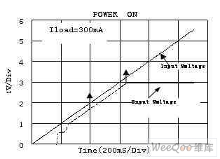 在測試壓差(Dropout)時不同的廠家有不同的標準。德州儀器(TI)電壓差定義為輸出電壓較其標稱值跌落2%時的輸入、輸出電壓的差值.其它的如,美信(Maxim),聖邦微電子(SGMC)電壓差定義為輸出電壓較其標稱值小於100mV時的輸入、輸出電壓的差值.如圖為聖邦微電子的SGM2007負載為300mA時輸入電壓和輸出電壓的曲線。