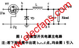 一般來講,正激型開關電源主電路可用圖1所示的降壓斬波器簡化表示,Ug表示控製電路的PWM輸出驅動信號。根據選用不同的PWM反饋控製模式,電路中的輸入電壓Uin、輸出電壓Uout、開關器件電流(由b點引出)、電感電流(由c點引出或d點引出)均可作為取樣控製信號。