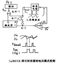 圖3(a)為BUCK降壓斬波器的電壓模式控製PWM反饋係統原理圖。電壓模式控製PWM是60年(nian)代(dai)後(hou)期(qi)開(kai)關(guan)穩(wen)壓(ya)電(dian)源(yuan)剛(gang)剛(gang)開(kai)始(shi)發(fa)展(zhan)而(er)采(cai)用(yong)的(de)第(di)一(yi)種(zhong)控(kong)製(zhi)方(fang)法(fa)。該(gai)方(fang)法(fa)與(yu)一(yi)些(xie)必(bi)要(yao)的(de)過(guo)電(dian)流(liu)保(bao)護(hu)電(dian)路(lu)相(xiang)結(jie)合(he),至(zhi)今(jin)仍(reng)然(ran)在(zai)工(gong)業(ye)界(jie)很(hen)好(hao)地(di)被(bei)廣(guang)泛(fan)應(ying)用(yong)。電(dian)壓(ya)模(mo)式(shi)控(kong)製(zhi)隻(zhi)有(you)一(yi)個(ge)電(dian)壓(ya)反(fan)饋(kui)閉(bi)環(huan),采(cai)用(yong)脈(mai)衝(chong)寬(kuan)度(du)調(tiao)製(zhi)法(fa),即(ji)將(jiang)電(dian)壓(ya)誤(wu)差(cha)放(fang)大(da)器(qi)采(cai)樣(yang)放(fang)大(da)的(de)慢(man)變(bian)化(hua)的(de)直(zhi)流(liu)信(xin)號(hao)與(yu)恒(heng)定(ding)頻(pin)率(lv)的(de)三(san)角(jiao)波(bo)上(shang)斜(xie)坡(po)相(xiang)比(bi)較(jiao),通(tong)過(guo)脈(mai)衝(chong)寬(kuan)度(du)調(tiao)製(zhi)原(yuan)理(li),得(de)到(dao)當(dang)時(shi)的(de)脈(mai)衝(chong)寬(kuan)度(du),見(jian)圖(tu)3(a)中波形所示。逐個脈衝的限流保護電路必須另外附加。當輸入電壓突然變小或負載阻抗突然變小時,因為主電路有較大的輸出電容C及電感L相移延時作用,輸出電壓的變小也延時滯後,輸出電壓變小的信息還要經過電壓誤差放大器的補償電路延時滯後,才能傳至PWM比較器將脈寬展寬。這兩個延時滯後作用是暫態響應慢的主要原因。