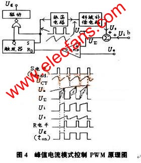 因而合成波形信號UΣ要yao有you斜xie坡po補bu償chang信xin號hao與yu實shi際ji電dian感gan電dian流liu信xin號hao兩liang部bu分fen合he成cheng構gou成cheng。當dang外wai加jia補bu償chang斜xie坡po信xin號hao的de斜xie率lv增zeng加jia到dao一yi定ding程cheng度du,峰feng值zhi電dian流liu模mo式shi控kong製zhi就jiu會hui轉zhuan化hua為wei電dian壓ya模mo式shi控kong製zhi。因yin為wei若ruo將jiang斜xie坡po補bu償chang信xin號hao完wan全quan用yong振zhen蕩dang電dian路lu的de三san角jiao波bo代dai替ti,就jiu成cheng為wei電dian壓ya模mo式shi控kong製zhi,隻zhi不bu過guo此ci時shi的de電dian流liu信xin號hao可ke以yi認ren為wei是shi一yi種zhong電dian流liu前qian饋kui信xin號hao,見jian圖tu4所(suo)示(shi)。當(dang)輸(shu)出(chu)電(dian)流(liu)減(jian)小(xiao),峰(feng)值(zhi)電(dian)流(liu)模(mo)式(shi)控(kong)製(zhi)就(jiu)從(cong)原(yuan)理(li)上(shang)趨(qu)向(xiang)於(yu)變(bian)為(wei)電(dian)壓(ya)模(mo)式(shi)控(kong)製(zhi)。當(dang)處(chu)於(yu)空(kong)載(zai)狀(zhuang)態(tai),輸(shu)出(chu)電(dian)流(liu)為(wei)零(ling)並(bing)且(qie)斜(xie)坡(po)補(bu)償(chang)信(xin)號(hao)幅(fu)值(zhi)比(bi)較(jiao)大(da)的(de)話(hua),峰(feng)值(zhi)電(dian)流(liu)模(mo)式(shi)控(kong)製(zhi)就(jiu)實(shi)際(ji)上(shang)變(bian)為(wei)電(dian)壓(ya)模(mo)式(shi)控(kong)製(zhi)了(le)。