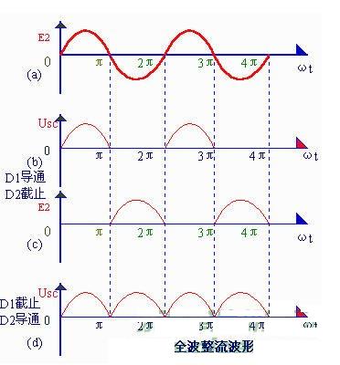 全波整流電路的工作原理,可用圖5-4所示的波形圖說明。在0~π間內,e2a對Dl為正向電壓,D1導通,在Rfz上得到上正下負的電壓;e2b對D2為反向電壓,D2不導通(見下圖在π-2π時間內,e2b對D2為正向電壓,D2導通,在Rfz上得到的仍然是上正下負的電壓;e2a對D1為反向電壓,D1不導通(見下圖如此反複,由於兩個整流元件D1、D2輪流導電,結果負載電阻Rfz上在正、fulianggebanzhouzuoyongqijian,douyoutongyifangxiangdedianliutongguo,rutusuoshidenayang,yincichengweiquanbozhengliu,quanbozhengliubujinliyonglezhengbanzhou,erqiehaiqiaomiaodiliyonglefubanzhou,congerdadaditigaolezhengliuxiaolv(Usc=0.9e2,比半波整流時大一倍)。