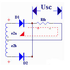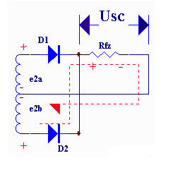 全(quan)波(bo)整(zheng)流(liu)電(dian)路(lu),可(ke)以(yi)看(kan)作(zuo)是(shi)由(you)兩(liang)個(ge)半(ban)波(bo)整(zheng)流(liu)電(dian)路(lu)組(zu)合(he)成(cheng)的(de)。變(bian)壓(ya)器(qi)次(ci)級(ji)線(xian)圈(quan)中(zhong)間(jian)需(xu)要(yao)引(yin)出(chu)一(yi)個(ge)抽(chou)頭(tou),把(ba)次(ci)組(zu)線(xian)圈(quan)分(fen)成(cheng)兩(liang)個(ge)對(dui)稱(cheng)的(de)繞(rao)組(zu),從(cong)而(er)引(yin)出(chu)大(da)小(xiao)相(xiang)等(deng)但(dan)極(ji)性(xing)相(xiang)反(fan)的(de)兩(liang)個(ge)電(dian)壓(ya)e2a、e2b,構成e2a、D1、Rfz與e2b、D2、Rfz,兩個通電回路。