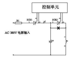 控製原理是:首先通過380V交流電給C1充電,正半周SCR1導通,完成充電過程,負半周SCR1自動截止,C1電壓一直保持到下一個正半周期信號到來。此時開通SCR2,使C1、L1形成回路,產生自由震蕩並完成放電。如此反複循環,即達到了理想的磁場波形。