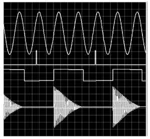 為此控製單元給SCR1和SCR2施加的控製信號的仿真波形如圖3所示,其中還包含有交流電輸入信號和震蕩輸出信號,從上到下的波形依次為輸入的交流電信號、SCR1的控製信號、SCR2的控製信號、震蕩線圈信號的波形。