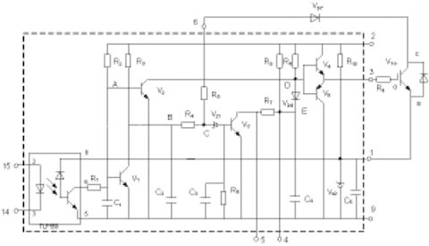 圖1為EXB841的驅動原理。其主要有三個工作過程:正常開通過程、正常關斷過程和過流保護動作過程。14和15兩腳間外加PWM控製信號,當觸發脈衝信號施加於14和15引腳時,在GE兩端產生約16V的IGBT開通電壓;當觸發控製脈衝撤銷時,在GE兩端產生-5.1V的IGBT關斷電壓。過流保護動作過程是根據IGBT的CE極間電壓Uce的大小判定是否過流而進行保護的,Uce由二極管Vd7檢測。當IGBT開通時,若發生負載短路等發生大電流的故障,Uce會上升很多,使得Vd7截止,EXB841的6腳“懸空”,B點和C點電位開始由約6V上升,當上升至13V時,Vz1被擊穿,V3導通,C4通過R7和V3放電,E點的電壓逐漸下降,V6導通,從而使IGBT的GE間電壓Uce下降,實現軟關斷,完成EXB841對IGBT的保護。射極電位為-5.1V,由EXB841內部的穩壓二極管Vz2決定。