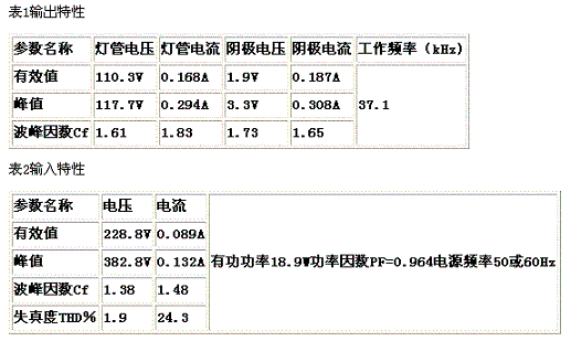 從圖3、4和表3、4中有關數據可以看出,它的輸入電流導通角為180°,沒有死區,電壓、電流基本同相位。PF>0.97,電流諧波在18%左右,Cf在1.6左右。由於電路簡單,工作又比較可靠,所以比較適用於電子鎮流器電路。