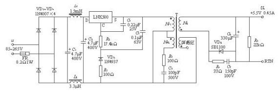 1)采用高效率恒壓/恒流式單片開關電源LNK500,交流輸入電壓範圍是85~265V,當交流輸入電壓為265V時,漏電流<5μA,額定輸出電壓為5.5V,最大輸出電流為0.45A,輸出功率為2.5W。