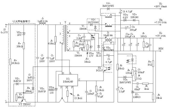 1)采用DPA424P型單片開關式穩壓器,構成正激、隔離式、3路輸出的DC/DC電源變換器模塊。直流輸入電壓範圍是36~75V,3路輸出分別為5V/2.4A、7.5V/0.4A和20V/10mA,總輸出功率為15.2W,開關頻率為400kHz;