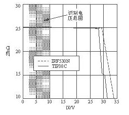 如圖4所示為使用MOSFET(V3)的開關電路。VDZ4及VDZ5分別采用28V及15V穩壓管。當輸入電壓超過28V時VDZ4被反向擊穿,使V3導通,將電源開啟。當輸入電壓超過43V時VDZ5也被反向擊穿,能限製V3的柵-源電壓,起到保護作用。R15能防止V3被誤導通。該以太網電源模塊的識別信號阻抗與輸入電壓的關係曲線如圖5所示,識別電壓範圍是2.5~10V。