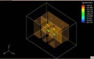 保持ICEPAK 對求解參數的默認設置,求解過程約需40 分鍾。從圖1 可以看出:功率管表麵的最高溫度為102°C(模型中有六個openings ,迭代次數為140),與理論計算值相符。改變模型中的相關參數,我們對散熱器進行了優化設計,結果表明:散熱器底板厚度為6mm比較適合, 另外, 不宜為了增加肋片數目而過度減小肋片間距, 最終取8.6mm 。