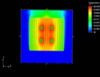 jinguansanreqidecanshuyouhuaduiwenshengkongzhilveyougaishan,danrengbunengmanzugonglvguandekekaoxingyaoqiu,yinci,womenkaolvqiangpofenglengdesanrefangshi。zaishangshujisuanmoxingdejichushang,womenzaichuizhifangxiangshedingliutideliusuwei1.5m/s , 即(ji)在(zai)散(san)熱(re)器(qi)底(di)部(bu)送(song)風(feng),其(qi)他(ta)參(can)數(shu)不(bu)變(bian)。我(wo)們(men)注(zhu)意(yi)到(dao),此(ci)時(shi)係(xi)統(tong)給(gei)出(chu)的(de)流(liu)態(tai)為(wei)紊(wen)流(liu)。在(zai)初(chu)始(shi)條(tiao)件(jian)中(zhong)作(zuo)相(xiang)應(ying)的(de)調(tiao)整(zheng)後(hou),最(zui)終(zhong)求(qiu)得(de)的(de)器(qi)件(jian)表(biao)麵(mian)最(zui)高(gao)溫(wen)度(du)約(yue)為(wei)89°C。散熱器底板截麵溫度圖及橫向風速雲圖分別見圖2、3。