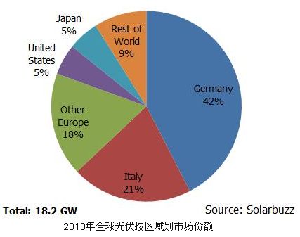 2010年,全球前五大光伏市場國家為德國、意大利、捷克共和國、日本與美國,這五個國家占據了全球80%的需求。其中歐洲地區光伏市場規模為14.7GW,占據全球81%的需求。歐洲區域前三大光伏市場國家依序為德國、意大利與捷克共和國,此三國家市場規模共計12.9GW。2010年日本與美國市場的增長非常迅速,年成長分別達到101%與96%。總體來說,2010年超過100個國家為光伏產業需求的迅猛增長做出了貢獻。