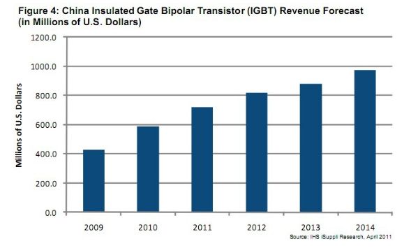 據IHS iSuppli公司的研究,由於工業與消費領域的需求增長,中國絕緣柵雙極型晶體管(IGBT)市場未來幾年將快速增長,2014年銷售額將從2009年的4.297億美元上升到9.75億美元,增長一倍以上。