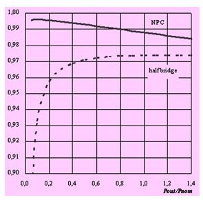 圖12 npc逆變橋輸出效率(實線)和半橋逆變效率(虛線)比較