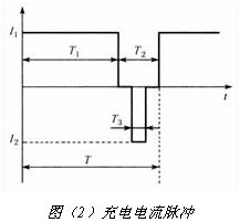 快速充電器根據實時檢測到的電池組的端電壓、充電電流、溫度、動態內阻等信息,按照馬斯充電定律,通過采用智能控製算法實施對充電電流脈衝寬度T1、間歇時間T2、放電電流脈衝T3的(de)分(fen)段(duan)調(tiao)節(jie),以(yi)消(xiao)除(chu)被(bei)充(chong)電(dian)電(dian)池(chi)組(zu)的(de)電(dian)極(ji)化(hua)現(xian)象(xiang),使(shi)電(dian)池(chi)組(zu)時(shi)刻(ke)處(chu)於(yu)較(jiao)佳(jia)的(de)電(dian)流(liu)接(jie)受(shou)狀(zhuang)態(tai),提(ti)高(gao)充(chong)電(dian)速(su)度(du)和(he)充(chong)電(dian)效(xiao)率(lv)。具(ju)體(ti)控(kong)製(zhi)過(guo)程(cheng)是(shi),首(shou)先(xian)用(yong)較(jiao)寬(kuan)的(de)充(chong)電(dian)脈(mai)衝(chong)進(jin)行(xing)充(chong)電(dian),蓄(xu)電(dian)池(chi)的(de)端(duan)電(dian)壓(ya)上(shang)升(sheng),當(dang)到(dao)達(da)充(chong)電(dian)時(shi)間(jian)T1時,充電器暫停充電,當充電間歇時間達到T2時充電器繼續充電,如此反複,如圖(2)所示。