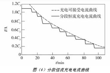 其次,分段恒流充電智能化控製技術通過減小各段恒流值下降梯度(分段數增加),可使實際充電電流曲線更接近充電可接受電流曲線。通過試驗確定該型電池初次恒流值I(1),並減小階段恒流充電的電流下降幅度。如果降低充電電流後,達到充電終止容量梯度值的時間很短 (設定一個最小充電時間),則適當增大電流下降的幅度。分段恒流充電電流曲線如圖(4)所示。