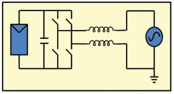 無變壓器的DC/AC逆變器在歐洲廣泛應用,但是在美國,這種產品隻是最近才在某些地區被使用。無變壓器的逆變器拓撲結構有很多種,而Fraunhofer研究所開發的HERIC拓撲表現出了很高的效率。傳統的全橋逆變器的結構如圖1所示,HERIC拓撲如圖2所示,此圖中還顯示了兩種新的開關/二極管對。這種拓撲利用獨有的續流路徑來減小開關和導通損耗,使效率提升到98%以上。
