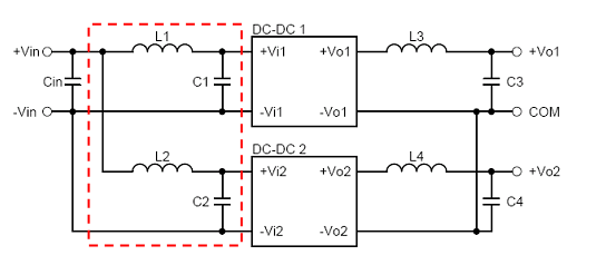 在zai一yi電dian源yuan係xi統tong中zhong,若ruo同tong時shi使shi用yong多duo組zu電dian源yuan模mo塊kuai,且qie輸shu入ru端duan使shi用yong同tong一yi電dian源yuan時shi,為wei防fang止zhi二er組zu或huo多duo組zu電dian源yuan模mo塊kuai之zhi間jian的de交jiao互hu幹gan擾rao,形xing成cheng係xi統tong所suo不bu樂le見jian的deEMI問題,甚至造成係統誤動作的諧波,此時,可在電源係統前端與EMI filter之間加入L1、C1、L2與C2來減低電源模塊之間的交互幹擾。