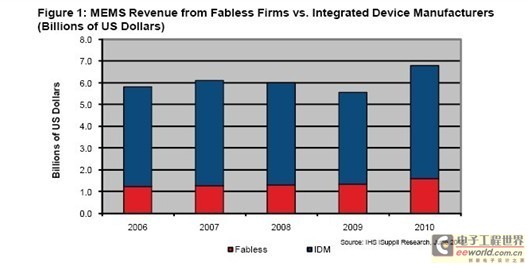 圖所示為2006-2010年IDM與無晶圓製造半導體公司的MEMS營業收入。