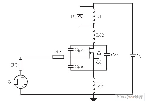 RG+Rg是IGBT的柵極電阻, L01、L02、L03是雜散電感(分布電感), Cgc、Cge、Cce是IGBT的極間電容, U1是驅動控製信號, U2為母線電壓。
