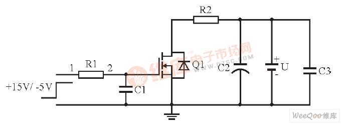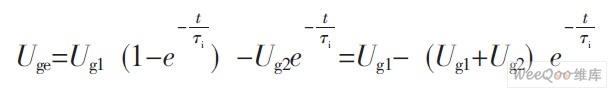 二極管D1導通時, 若Uge為所加的反向電壓值(可記為-Ug2, 正向電壓記為+Ug1), 集電極電流iC=0, Uce=U2。開通後, U1向Cgc、Cge充電, 此時Uge可寫成: