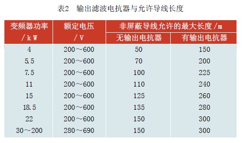 在變頻器的輸出側是否要配置電抗器,可根據工程實際情況而定。表2 是輸出濾波電抗器與允許導線長度。