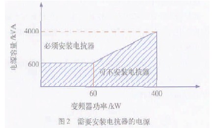 1 ) 變頻器所用之處的電源容量與變頻器容量之比為10∶1 以上;電源容量為600 kVA 及以上,且變頻器安裝位置離大容量電源在10 m 以內。圖2 為需要安裝輸入電抗器的電源容量。