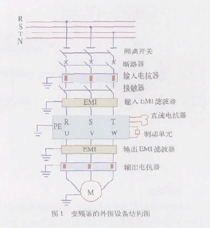 變bian頻pin器qi外wai圍wei保bao護hu設she備bei的de組zu成cheng為wei了le提ti高gao變bian頻pin器qi的de工gong作zuo性xing能neng,實shi現xian變bian頻pin器qi和he電dian動dong機ji的de保bao護hu,減jian少shao變bian頻pin器qi和he周zhou圍wei其qi他ta電dian氣qi設she備bei的de相xiang互hu影ying響xiang,在zai變bian頻pin器qi的de輸shu入ru、輸出端配備的外圍保護設備如圖1 所示。