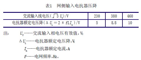 1)輸入電抗器壓降的選擇 輸入電抗器的容量一般按預期在電抗器每相繞組上的壓降來決定,而選擇壓降或用網側相電壓的2%~4%,或按表1 的數據選取。