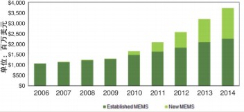 新應用中的明星產品是用於以蘋果公司iPhone 4為代表的智能手機和Sony公司PlayStation 3為代表的遊戲機中的3軸加速器,此外,還可見於蘋果的iPad 2和三星Galaxy等平板電腦。另一紅火產品是嵌入手機和數碼相機的微投影器,預期到2014年兩者的銷售額合計可達14億美元。