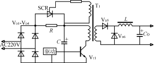 該電路如圖3所示。在電源瞬時接通時,輸入電壓經整流橋VD1VD4和限流電阻R對電容器C充電。當電容器C充電到約80%的額定電壓時,逆變器正常工作,經主變壓器輔助繞組產生晶閘管的觸發信號,使晶閘管導通並短路限流電阻R,開關電源處於正常運行狀態。