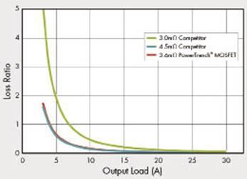 在同步整流中,要降低QSYNC,CGS(Ciss-Crss)是更加關鍵的因數。如圖8所示,由於設計優化,相比4.5毫歐的競爭產品,3.6毫歐PowerTrench MOSFET的CGS大幅度減小。如表1所示,相比4.5毫歐和3.0毫歐的競爭器件,3.6毫歐PowerTrench MOSFET的QSYNC分別降低了22%和59%。圖9對柵極驅動電壓為10V,開關頻率為100kHz的27V同步整流級的驅動損耗和傳導損耗之比進行了計算和比較。這裏有兩個同步開關,在10%的負載條件下,3.0毫歐競爭產品的驅動損耗是傳導損耗的兩倍。