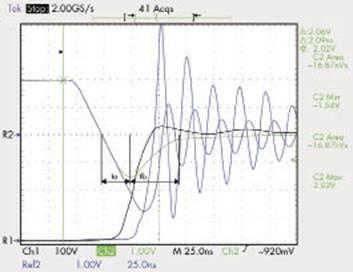 把ba有you害hai電dian壓ya尖jian刺ci降jiang至zhi最zui小xiao的de一yi般ban原yuan則ze是shi采cai用yong短duan而er厚hou的de電dian路lu板ban以yi及ji最zui小xiao的de電dian流liu回hui路lu。然ran而er,由you於yu尺chi寸cun和he成cheng本ben的de限xian製zhi,做zuo到dao這zhe些xie並bing不bu容rong易yi。有you時shi,設she計ji人ren員yuan必bi需xu考kao慮lv到dao機ji械xie結jie構gou的de問wen題ti,如ru散san熱re器qi和he風feng扇shan;有you時shi鑒jian於yu成cheng本ben限xian製zhi因yin素su,不bu得de不bu使shi用yong單dan麵mian印yin製zhi電dian路lu板ban。緩huan衝chong電dian路lu可ke作zuo為wei一yi種zhong可ke行xing的de替ti代dai方fang案an,用yong來lai在zai最zui大da額e定ding漏lou源yuan電dian壓ya範fan圍wei內nei管guan理li電dian壓ya尖jian刺ci。這zhe種zhong情qing況kuang下xia,額e外wai的de功gong耗hao是shi無wu法fa避bi免mian的de。此ci外wai,輕qing載zai下xia緩huan衝chong電dian路lu本ben身shen產chan生sheng的de功gong耗hao也ye不bu可ke忽hu視shi。除chu了le電dian路lu板ban參can數shu之zhi外wai,器qi件jian的de特te性xing也ye對dui電dian壓ya尖jian刺ci電dian平ping有you影ying響xiang。在zai同tong步bu整zheng流liu中zhong,一yi個ge主zhu要yao的de器qi件jian相xiang關guan參can數shu是shi反fan向xiang恢hui複fu期qi間jian的de體ti二er極ji管guan軟ruan度du因yin子zi(softness)。基本上,二極管的反向恢複特性是由設計決定的。有好幾個控製輸入對反向恢複產生影響,如結溫、di/dt和正向電流水平。但是,當條件固定時,二極管總是表現出相同的行為。因此,器件的評估結果對評測係統的運作情況非常有用。圖10所示為兩個不同器件(但有極其相似的額定值)的反向恢複波形。