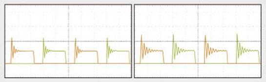 圖11 500W PSFB DC-DC轉換器中功率MOSFET的峰值漏-源電壓,軟器件(左),snappy器件(右)ruantierjiguandelingyigeyoudianshitanenggoushiyongedingjichuandianyajiaodideqijian。youyudanweimianjidedaotongzukangyujichuandianyachengbili,gutahainengjiangdichuandaosunhao。
