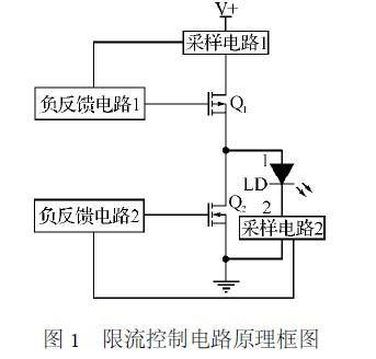 Q1為P型MOS管,Q2為N型MOS管。流過Q1的電流通過采樣電路1變為電壓信號與基準電壓相比較,通過負反饋電路1控製,可使得流過Q1的電流恒定。通過半導體激光器LD的電流經過采樣電路2變為電壓信號與電流調節端電壓相比較,如果流過半導體激光器的電流超過設定值,經過負反饋電路2調節使得通過Q2的電流增加,導致通過LD電流減小;流過LD的電流太小,經過采樣電路2、負反饋電路2調節可使得流過Q2的電流變小,導致流過LD的電流變大,如此反複,通過負反饋電路的控製可使得流過半導體激光器的電流恒定,這種負反饋過程建立的時間很快。