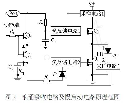 調節R5、C1和R6、C2參數可以使得t2mt1。這樣在t1階段,通過負反饋電路1的控製使得Q1慢慢導通,流過Q1電流從零直到恒定,這時由於t2mt1,C2上還有電壓,通過負反饋電路2的控製使得Q2處於導通狀態,這樣流過Q1的電流,以及由於Q1開通產生的浪湧電流全部由Q2吸收,然後隨著時間的增加C2電壓慢慢降為零,流過Q2的電流慢慢減小,LD上電流慢慢增加直到達到設定值。