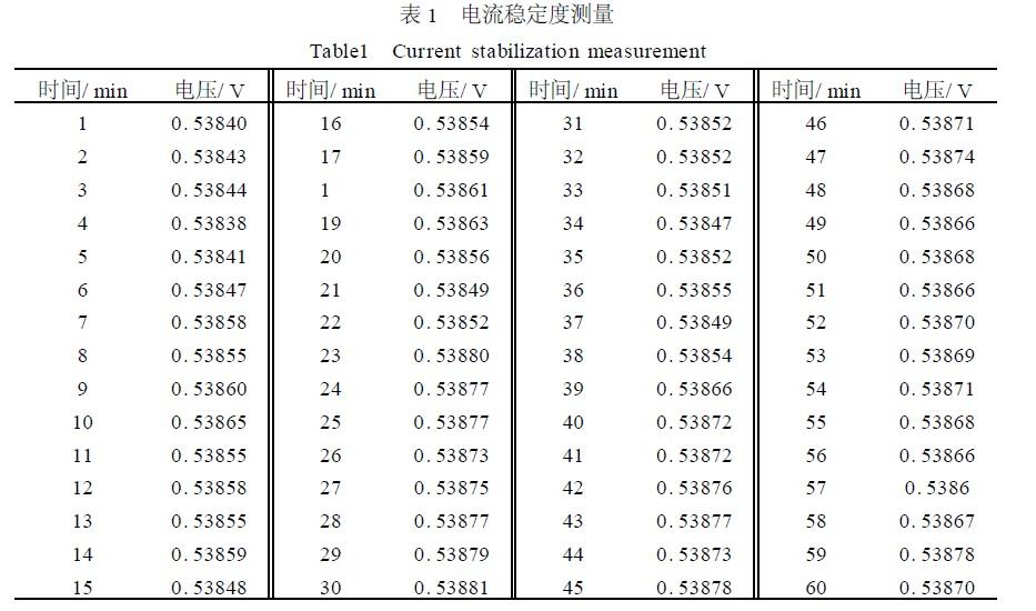 qudongdianyuanyigezhongyaojishucanshuweidianliuwendingdu。dianliuwendingdushizaiyidingshijiannei,duociceliangtongguofuzaidedianliudaxiao,ranhoutongguoshuxuejisuandechushuchudianliuwendingdudaxiao。shiyanzhongmeijiangeyifenzhongceliangyici,celiangshijianchixuyigexiaoshi。celiangshi,yong1.2Ω50W電阻作為模擬負載,測量模擬負載的兩端電壓,用模擬負載兩端電壓穩定性來標定電流穩定性。測量儀器為:電壓測量儀器:Agilent34401A61/2digitmultime2ter,其精度可以達到0.00001V;供電電源為Agi2lentE3631AtripleoutputDCpowersupply12V,1A。電流穩定度實驗數據如表1所示。