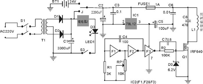 經繼電器J選擇的+24V直流電主要為發射線圈L1供電,此外,經IC1(78L12)降壓後為集成電路IC2供電,為保證J的動作不影響發送電路的穩定工作,電容C3的容量不得小於2200uF。